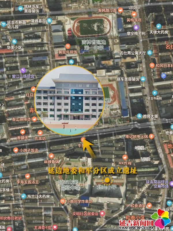 延邊地委和軍分區(qū)成立遺址位于現在延吉市北山小學。延邊人民武裝建立初期,由抗聯分遣隊、關內朝鮮義勇軍進駐延邊擴建的部隊,由黨中央派干部建立延吉軍分區(qū)。